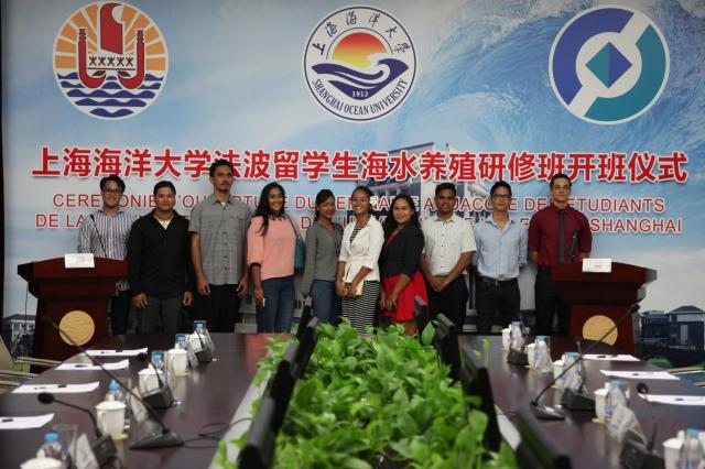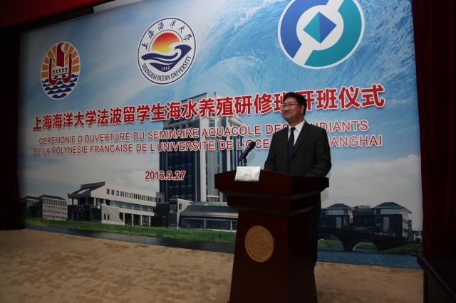 2016年9月27日上午, 冰球突破mg正规官网法波留学生海水养殖研修班开班仪式在图文中心102会议室举行。法属波利尼西亚蓝色经济部部长Teva Rohfritsc,蓝色经济部专员 Laurene Moux,海洋资源署水产养殖工程师MoanaMaamaatuaiahutapu,劳动部技术顾问Johanna CROS-FROGIER在中国人民对外友好协会美大部副主任郝忠伟、天瑞投资集团管理有限公司总裁王成的陪同下专程来校参加开班仪式。上海市教委副主任丁晓东、国际交流处处长杨伟人也参加了此次开班仪式。