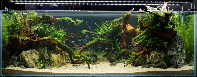 本届赛事赛制与往届不同,各参赛团队需在校内制作实物,网上提交影像作品初评,决赛前往大连参加现场答辩。赛事通知的发出到提交作品只有短短20余天,时间紧、任务重,给各高校参赛团队带来了很大的压力。冰球突破官网参赛选手梁炳辉、王童、问高生团队在综合考虑硬件资源、作品风格、成景时间等因素的基础上,决定不使用生长周期长的前景草,构建能快速成景的以青龙石和杜鹃根为主体框架的亚马逊丛林风格水景。在两位老师的指导下,经过长达20余天细心的构图、造景、维护和修整工作,该作品不论是整体还是局部都达到了令人满意的状态。