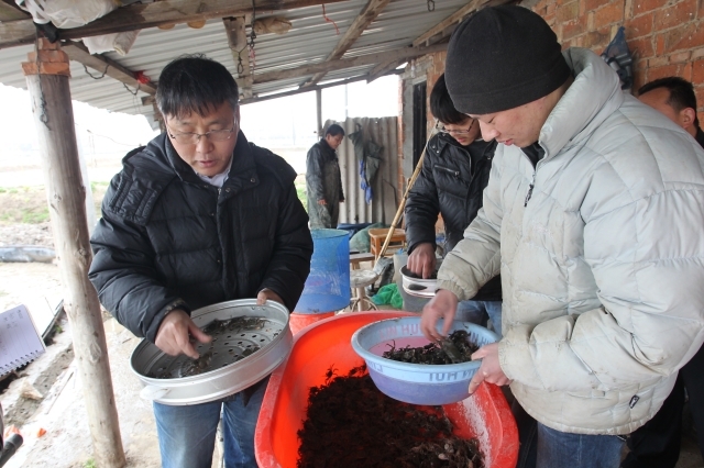 成永旭教授与研究生在崇明基地内精挑细选第三批供台扣蟹