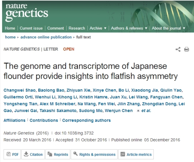 2016年12月6日,著名杂志《Nature Genetics》(影响因子31.616)在线发表中国水产科学研究院黄海水产研究所陈松林实验室、冰球突破mg正规官网鲍宝龙实验室、华大基因等单位合作的研究论文《The genome and transcriptome of Japanese flounder provide insightsinto flatfish asymmetry》(http://www.nature.com/ng/journal/vaop/ncurrent/full/ng.3732.html))。鲍宝龙及其指导的硕士研究生陈新页作为共同第一作者(分别排第2和第4)。该论文完成了褐牙鲆全基因组解析并揭示了光传导通路调控变态过程眼睛移动和体色左右不对称建立的机制。