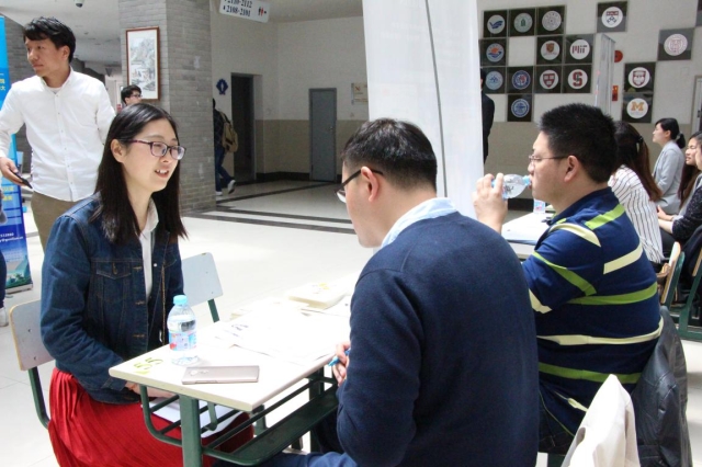 毕业生进入场内,与用人单位倾谈