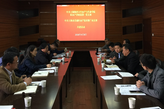 4月8日上午,冰球突破mg正规官网水产营养与饲料系支部和水产养殖技术与工程系支部联合青浦区水产技术推广站支部在学院B102举行了支部共建、结对学习活动。冰球突破mg正规官网党委书记张宗恩、院长谭洪新、副院长黄旭雄、副院长陈再忠、青浦区水产技术推广站党支部书记宋妙龙、站长张铷等出席,共建活动由水产营养与饲料系支部书记华雪铭主持。