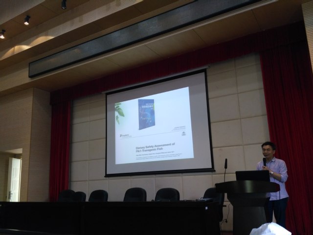 严教授结合最近发表的教材《健康与疾病的营养基因组学研究》首先介绍了世界卫生组织关于食品安全的定义,然后讲解了食物在人体内消化吸收和代谢的过程,特别提到食物中生物活性物质的重要性,要全面看待基因食品的研究及其安全评估。最后详细介绍了最近发表一篇文章(Flk-GFP转基因鱼的食用安全评估)。目前已完成的实验显示Flk-GFP转基因鱼会对食用的个体的子一代造成一定程度的特征性影响,但在停止食用转基因鱼后,这些影响在下一代又会消失。与学术界已发表的许多文章相比,本食物链模拟系统简便易行,从基因型-表型角度综合评估转基因鱼的食用影响,而且减少了种系差异。