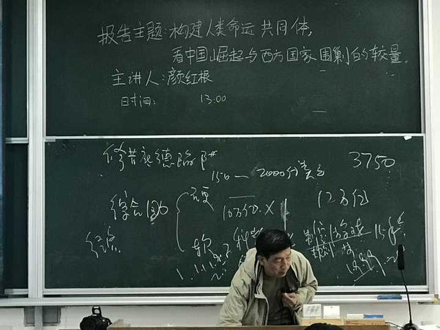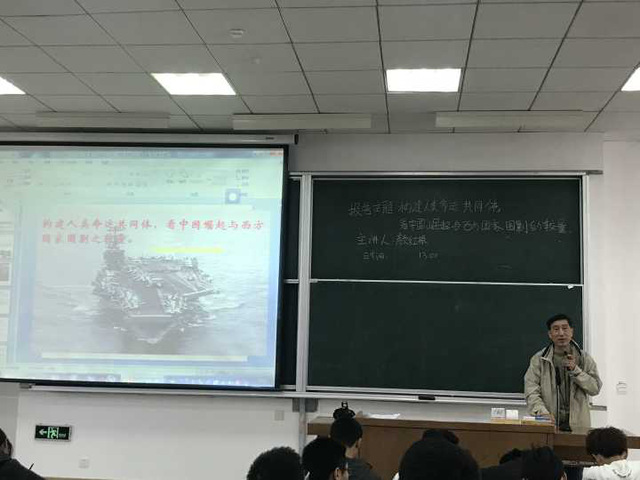 颜红根老师理性地为我们分析当今风云变幻的国际关系与形势,短短的两个半小时,老师结合了ppt及板书,为我们普及了许多关于国家与世界关系的知识,我们因此对国家的变化有了更深层次的理解。每位同学都受益匪浅。