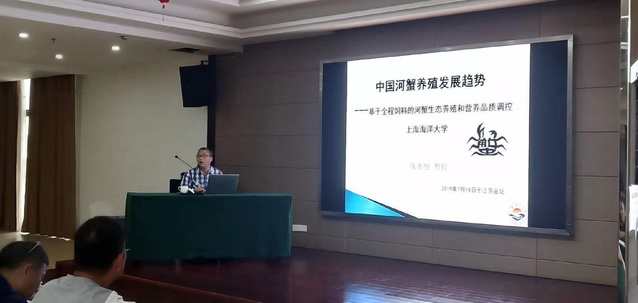 7月18日上午,服务团给金坛区渔业技术人员、龙头企业和养殖户代表进行了河蟹生态养殖技术培训,成永旭教授做了“基于全程配合饲料投喂的河蟹可持续养殖技术”培训,成教授指出河蟹养殖必需走“绿色、生态、安全、高效”的道路;然后从河蟹养殖模式现状、养殖产业存在问题、河蟹产业发展趋势、高品质河蟹养殖技术、蟹类品质评价和营养调控等方面进行了详细培训。吴旭干教授做了“河蟹扣蟹养殖生态养殖技术及高温期管理”的技术培训,从河蟹的生长特性和扣蟹营养、河蟹苗种选择、高温期的养殖管理、扣蟹饲料投喂技术和长荡湖1号河蟹选育进展及展望几个方面进行了培训,同时对养殖户提出了问题进行解答和讨论。