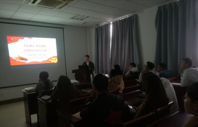 首先是支部书记讲“不忘初心,牢记使命”主题教育专题党课,“不忘初心,牢记使命”主题教育工作在支部开展已有一段时间,开展过程中支部做了详细的学习计划,布置了相应任务,目前十月份的学习计划已基本落实。为了更好地制定和完成接下来的学习目标,继续开展好主题教育各项工作。刘颖再次向同志们讲明了此次主题教育的背景意义、总体要求和根本任务,点名了主题教育是在全党开展的重要意义,强调党员同志们要坚持学原文、读原著、悟原理,用党的先进指导思想武装自己头脑,不断提升知识水平和业务能力,服务学校师生。刘颖以自身对《中国共产党章程》等文本的学习体会为引,给大家上了一次党课。他谈到,中国共产党先锋队的体现在于每一位普通党员是否能想在前面、做在前面、闯在前面。始终坚持宗旨意识,敢为人先、勇于斗争,肯吃苦耐劳,脚踏实地为人民服务才是党员先进性的表现。在困难面前,我们是一把利剑,攻坚克难;而在人民面前,我们是一座堡垒,坚实不摧。最后要求所有党员要严格对照党章的党员义务和党规党纪要求进行自检自纠,对查摆出的问题要及时整改,短期难以完成整改的,要制定长效机制坚持推进落实。