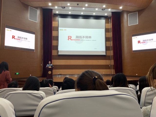 紧接着,王宵老师给大家做“我和我的简历”——简历制作专题讲座。王老师首先通过入职前自我推销4个步骤突出强调了简历的重要性,从简历的作用、简历的重点以及措辞如何准确表达三个方面告诉同学们如何让自己的简历脱颖而出。同时也告诉研一的同学努力用自己的行动制作出一份优秀的简历。