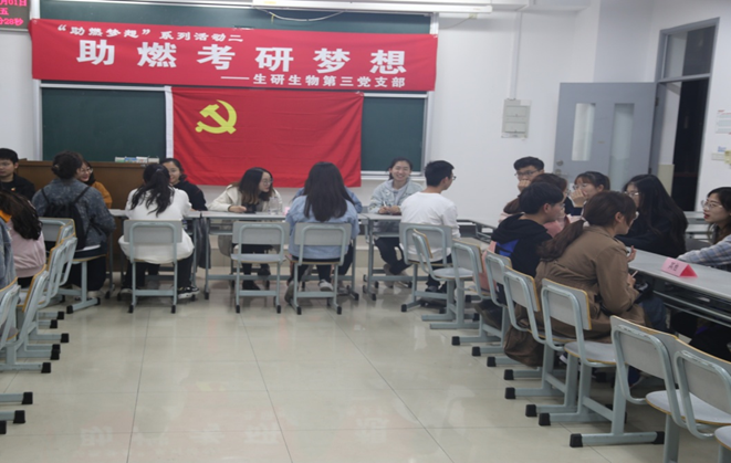 为了使冰球突破mg正规官网本科17级考研同学更加明确考研目标,掌握考研技巧,了解更多考研信息,提高考研成功率,2019年11月1日晚上9点,研究生生物学第三党支部和本科生物类党支部在2211教室联合举办了“助燃考研梦想”志愿服务主题党日活动,此次活动,支部党员共分为五个小组:英语组、政治组、引导组、摄影、其他(如考研期间心态调整等问题),各小组分工、相互配合,17级本科生来到现场咨询交流。