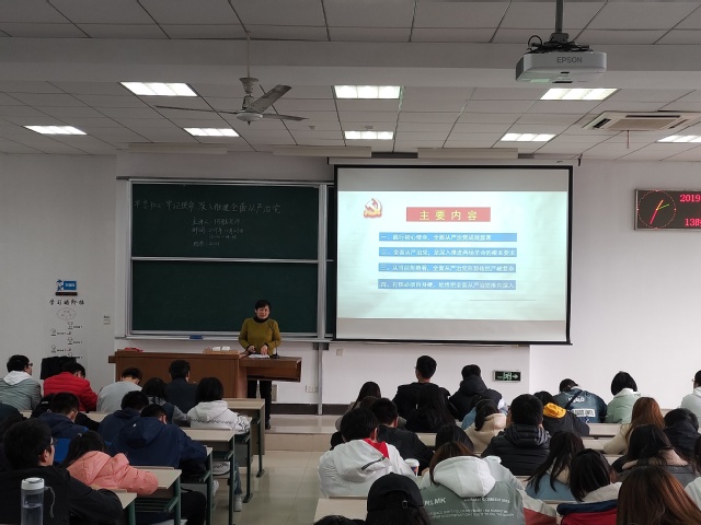 报告伊始,何雅带领在场同学回顾和总结了中国共产党98年的奋斗历程,并以“中国共产党成功的秘诀何在?”为切入点,介绍了我们党践行初心使命,全面从严治党的重要意义。何雅指出,纯洁党的组织和队伍,增强了党的创造力、凝聚力、战斗力,是我们党带领中国人民从站起来、富起来到强起来的制胜法宝。当前,我们夺取了反腐败斗争压倒性胜利,但从国际形势、国内形势和党内情况来看,全面从严治党形势依然严峻复杂。何雅指出:“深入推进全面从严治党,必须把权力关进制度的笼子里”,必须深入学习贯彻党的十九届四中全会精神,将全面从严治党制度纳入中国特色社会主义制度和国家治理体系之中。报告最后,何雅书记对在场的同学们提出了殷切的希望,作为新时代的青年要“扣好人生第一粒扣子”,坚定共产主义远大理想和中国特色社会主义共同理想,努力成长为中国特色社会主义事业合格建设者和可靠接班人。