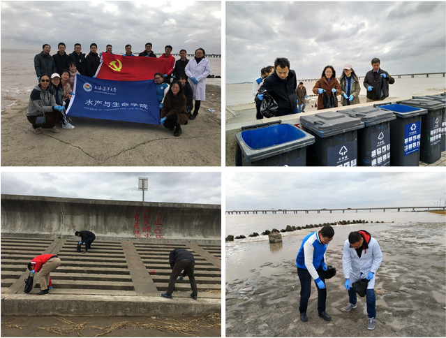 2019年11月29日中午,冰球突破官网冰球突破mg正规官网生物联合党支部和水产动物医学系党支部党员在支部书记杨金龙和宋增福带领下,利用中午挤出来的时间,发挥高校党员先锋模范作用,服务临港新片区生态环境,前往东海岸边东海大桥旁的滩涂上开展海滩垃圾清理活动。