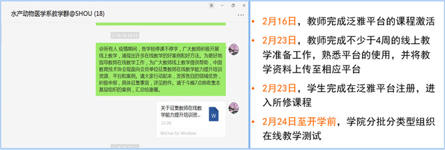 2020年春节刚过,就收到非常时期教育部和冰球突破官网关于“停课不停学”的号召。为保障春季学期教学工作的准确到位与落实,冰球突破mg正规官网水产动物医学系组织本系共计18名教师进行沟通与调整,最终核实本学期系内有14位专业老师担任共计29门次课程的教学。从2020年1月30日开始,在本系教学群里呼吁所有课程负责人学习在线授课的各种网络教学平台,鼓励各位老师筹备网上授课,引导所有任课老师下载在线办公app并加入在线办公程序。为保障在线顺利办公和教学工作的正常运行奠定了基础。
