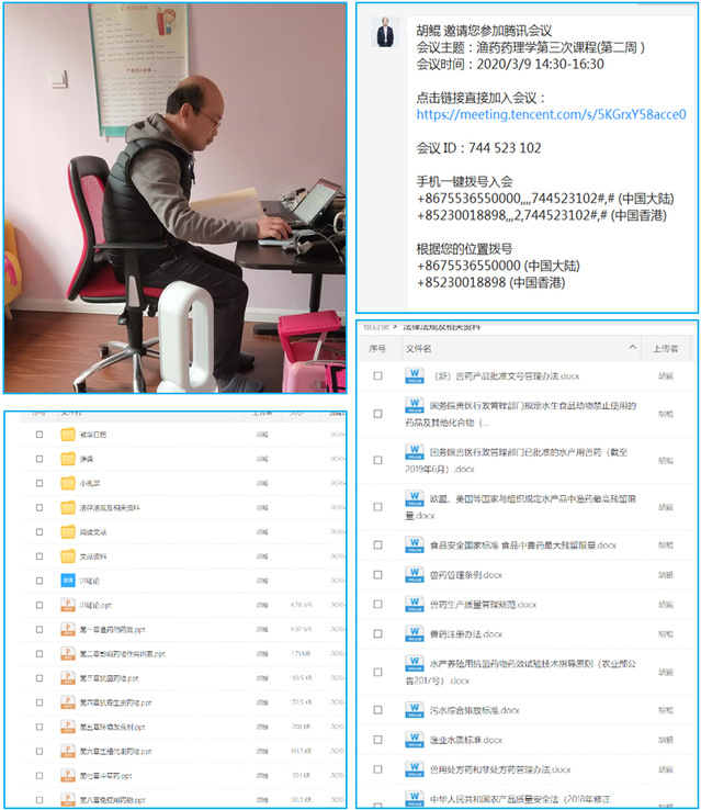 胡鲲老师具有资深的教学经历,不畏艰险,挑战自我,他主持的课程《鱼药药理学》,经多次尝试,并与学生沟通,最终确认用第三方“腾讯视频”进行在线直播方式。胡老师提前上传了各种课件和预习、复习的学习资料。并建立专课专用教学微信群,提前发布会议室,为确保信息安全,避免出现与教学无关的内容,在线直播课邀请各位学生和督导提前进入会议室课前,胡老师花费了很多时间和精力静心准备课件,做到胸有成竹,保障了直播课程的顺利进行,也得到了学生的肯定和支持。