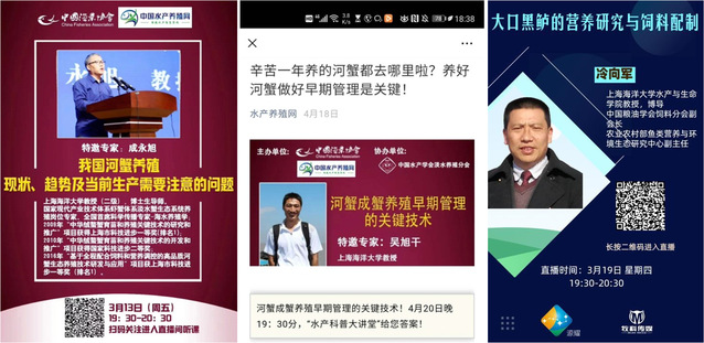 3月13日,博士生导师、国家现代产业技术体系虾蟹体系淡水蟹生态系统养殖岗位专家、全国首席科学传播专家成永旭教授向行业技术人员及广大养殖户群体进行“我国河蟹养殖现状、趋势及当前生产需要注意的问题”的直播课程。成永旭教授运用已有研究成果积极破解复工复产中的难点、堵点,推动全产业链联动复工。4月20日博士生导师、水产营养与饲料系主任吴旭干教授继续开展题为“河蟹优质大眼幼体培育及扣蟹养殖早期管理”与“河蟹成蟹养殖早期管理的关键技术”的直播讲座。吴旭干围绕“疫情对河蟹产业的影响”“池塘准备工作”“种草和种苗放养”“饲料投喂”及“水质调控和青苔防控”五个方面,对河蟹成蟹养殖的早期关键管理技术进行了详细讲解,结合自己从事河蟹养殖10多年的经验,用大量案例和图片等分析了成蟹养殖早期经常出现的“白浊水”“蜕壳不遂”“肝胰腺白化”“肠炎”“青苔滋生”的形成原因、预防措施和处理办法等。