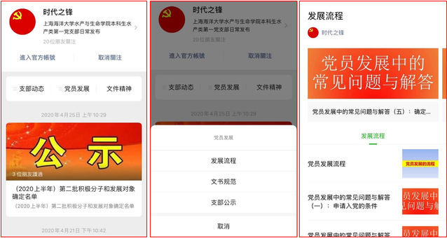 2019年4月,冰球突破mg正规官网本科生水产类第一党支部书记顾冰清提出,能否利用新媒体作为宣传媒介,来宣传支部的工作、组织生活以及解答同学们关心的党员发展问题?时任支部组织委员的盛祥提出可以利用微信公众平台,来尝试作为新媒体宣传工具。经过支委会讨论,首先确定了了公众号的名称、大致排版和要推送的文章,后经上级党组织的备案后,“时代之锋”公众号上线了!