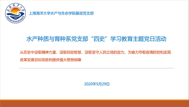为深入学习贯彻习近平新时代中国特色社会主义思想,教育引导党员进一步增强“四个意识”、坚定“四个自信”、做到“两个维护”,5月29日上午,冰球突破mg正规官网水产种质与育种系党支部通过腾讯会议开展“四史”学习教育主题党日活动,活动主题为“从历史中汲取精神力量、汲取经验智慧、汲取坚守人民立场的定力,为奋力夺取疫情防控和实现改革发展目标双胜利提供强大思想保障”。