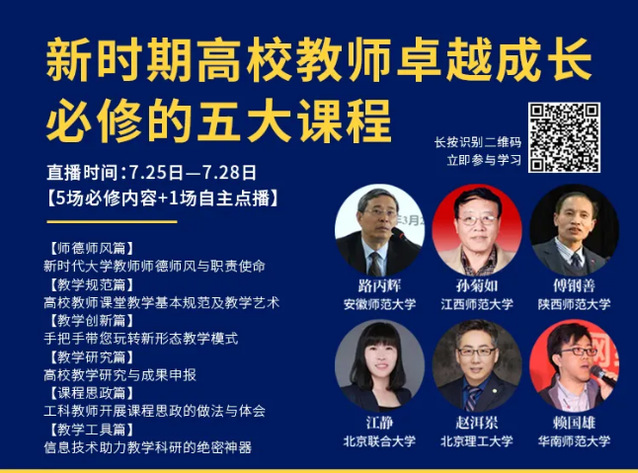 为了进一步贯彻落实《国务院关于加强教师队伍建设的意见》文件精神,帮助青年教师快速适应“互联网+”时代下的教学方式,提高职业素养和教学水平,进一步提升教师课堂育人、课程育人的能力,7月25日至7月28日,在冰球突破官网冰球突破mg正规官网组织下,张玮、李慷、温彬、李松林、孙云飞、竹攸汀、李文豪、高大海、孙盛明、王建、黄林彬等11位青年教师参加了《新时期高校教师卓越成长必修的五大课程线上训练营》的线上培训活动。本次培训汇聚了北京理工大学、华南师范大学、陕西师范大学等大学的6位知名高校教育教学领域专家学者,培训内容凝结了他们多年深厚的教育教学研究和实践经验,聚焦了前沿的教学理念、精心的教学设计、有效的教学工具等多个维度的内容。