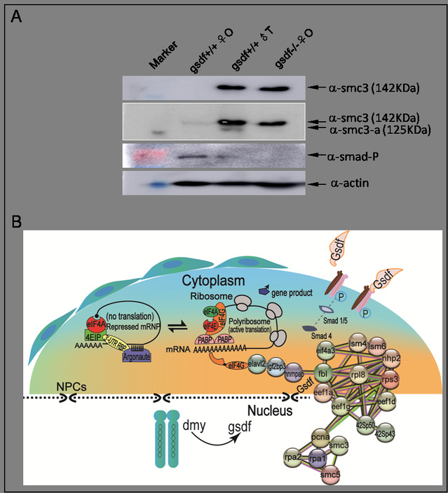 生殖细胞中Gsdf复合物调控下蛋白质翻译的细胞机制示意图