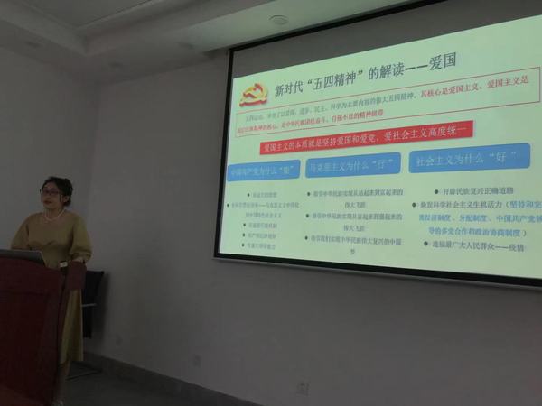 会上,院团委书记、学工办主任翟斯凡为大家解读了新时代五四精神。翟老师带领大家回顾了五四运动的起因、五四精神的内涵以及五四运动的标志性特点。五四运动促进了马克思主义在中国的传播,在我国人民寻找救亡图存的道路上是一个重要的转折点,五四运动是一场爱国、进步、民主、科学的运动。弘扬五四精神要坚持爱国主义,新时代爱国主义的本质就是坚持爱国和爱党、爱社会主义高度统一。只有热爱我们的国家和党,一心为国,坚决捍卫国家尊严,坚定不移跟党走,为国家富强而奋斗,才能尽早实现我们的伟大中国梦。