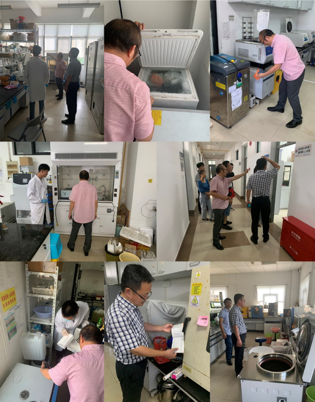 2021年6月28日,院实验室安全工作领导小组组长谭洪新院长亲自组织,带领分管安全工作的陈再忠副院长和实验管理中心相关人员,对实验室安全进行复查。检查过程中,谭院长十分关注特种设备的安全使用,重点检查灭菌锅是否登记注册、使用记录是否及时;针对烘箱和低温冰箱的使用,强调要有合适的散热空间并注意定期除冰;针对通风橱的规范使用,要求及时清理、不得堆放杂物;针对危化品的安全使用,重点检查危化品柜的配置是否齐全、记录是否完整、“五双”要求是否严格执行等。