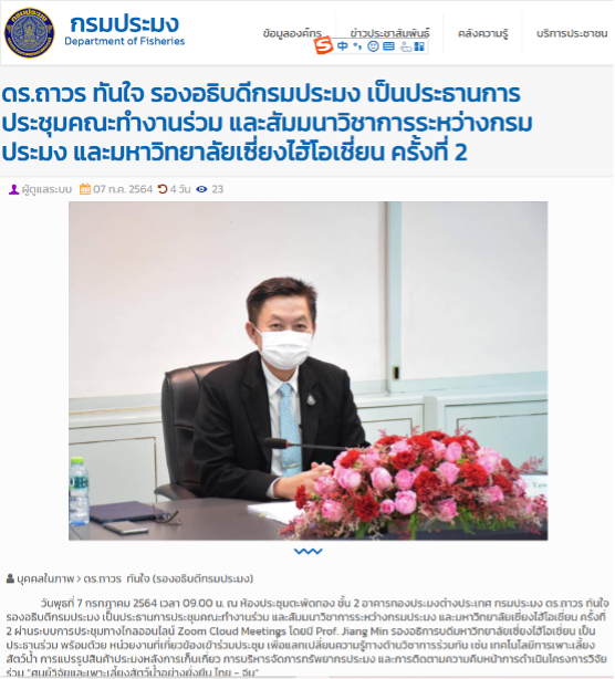 2021年7月7日星期三上午9:00,渔业司国际处大楼2楼金龙鱼会议室,渔业司副司长Taworn Thunjai与冰球突破mg正规官网副校长江敏通过线上会议系统Zoom Cloud共同主持第二届泰国渔业司与冰球突破mg正规官网联合研讨会暨工作会议。相关机构一并出席此次会议,进行学术知识交流。例如水产养殖技术、水产产品的收获后加工、渔业资源管理,并跟进联合研究项目 “泰中可持续水产养殖研究和推广中心”的进展。