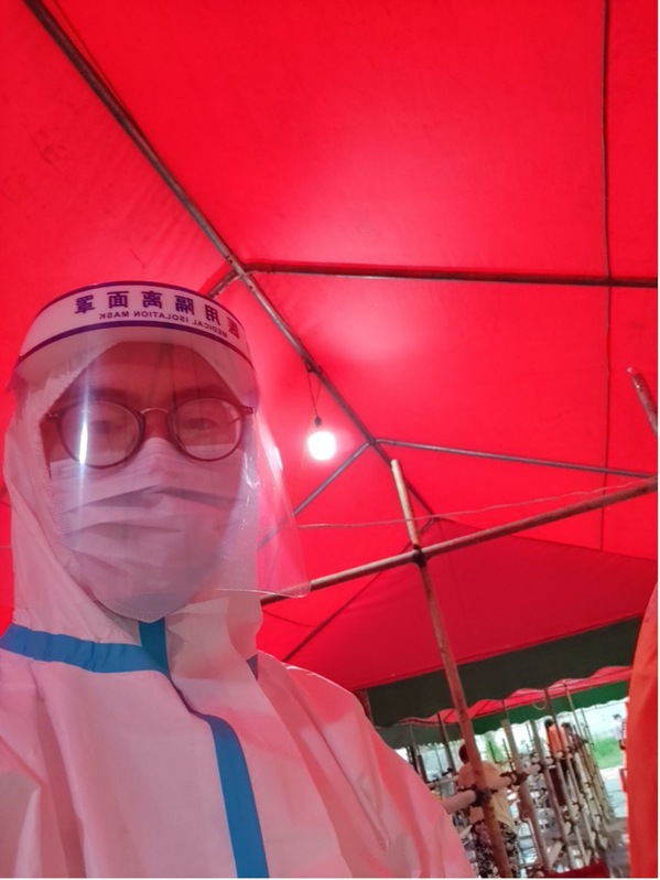 杨钊同学说:“在去支援承仪村核酸检测那晚,我们穿着全身防护服,三名志愿者轮班上岗,可以休息的时间很少。但反观进行核酸取样的医护人员,他们要在这么炎热的天气中连续工作,一定更加辛苦,我向她们致敬!作为一名新时代的青年,作为一名入党积极分子,面对疫情,我要勇于担当。不管身在何处,我都会用实际行动努力践行‘请党放心,强国有我’的诺言,为打赢这场疫情防控阻击战贡献自己的青春力量!”