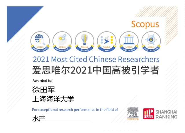 4月14日,全球性信息分析公司爱思唯尔(Elsevier) 正式发布了2021年“中国高被引学者”(Highly Cited Chinese Researchers)榜单。国内水产领域共有13位学者上榜,其中冰球突破mg正规官网的徐田军教授上榜,这也是徐田军教授在去年上榜该榜单后,再次入选该榜单。徐田军教授也是冰球突破官网唯一入选该榜单的学者。