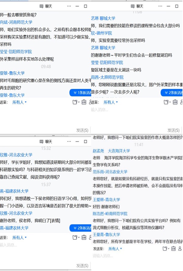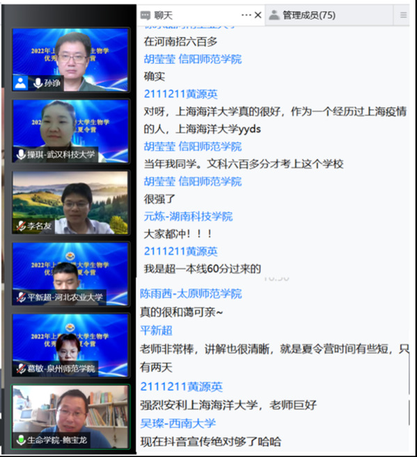 这些内容激发了营员们的强烈兴趣,大家提问活跃,关于备考、做实验、学英语、校园生活的话题一个接一个,师生互动持续了两个半小时,整个直播室气氛热烈。最后,营员们纷纷表示,本次夏令营活动涉及面广、干货多,和蔼可亲的导师团队和优秀热情的师兄师姐都给自己留下了深刻的印象;孙诤与鲍宝龙教授希望同学们将此次夏令营的所学所感带回自己的母校,更祝愿大家在明年的考研中取得优异成绩,在美丽的海大校园重聚!