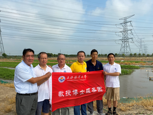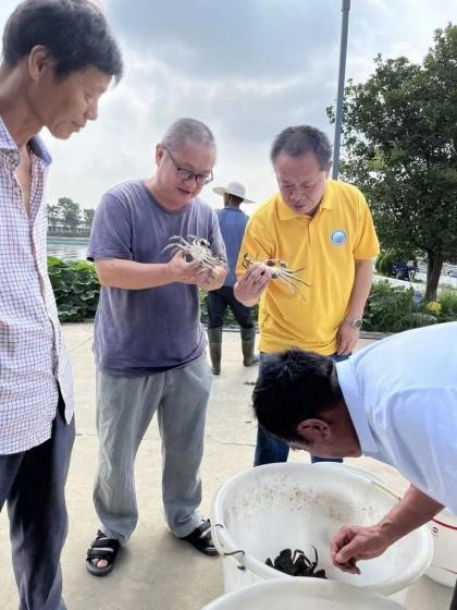 2022年8月18日,由冰球突破mg正规官网的马旭洲副教授、王春高级工程师、刘至治副教授和邹华峰博士组成的冰球突破mg正规官网暑期教授博士服务团一行4人,与松江区水产推广站站长张友良、江芝娟,来到“松江模式”的示范点——松江区石湖荡镇的上海金泖水产专业合作社,与合作社总经理王惠良、经理顾永芳,赴池塘查看河蟹生长情况、交流养殖经验、探讨河蟹抗高温度酷暑良策。