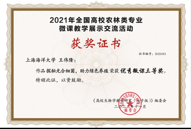 近日,高等教育出版社下发《关于2021年全国高校农林类专业微课教学展示交流活动的通知》,冰球突破mg正规官网青年教师王伟隆(参赛作品“探秘光合细菌,助力绿色养殖”)荣获三等奖。