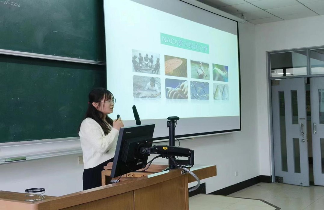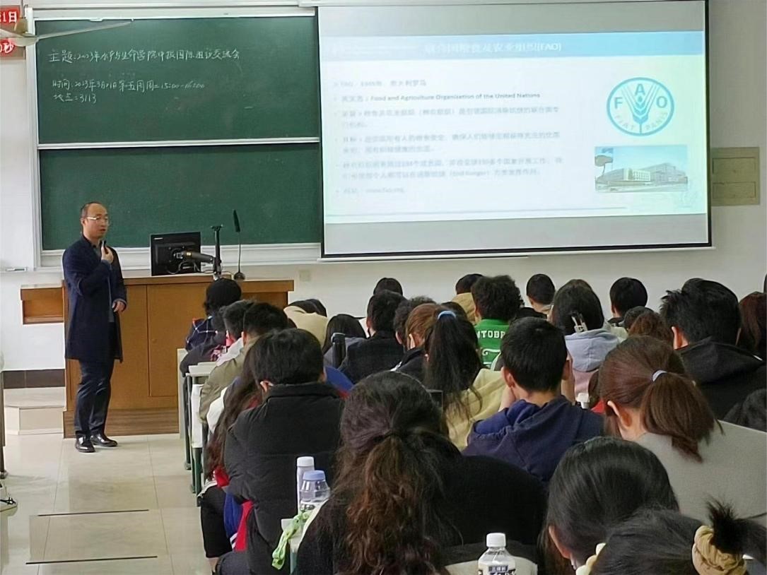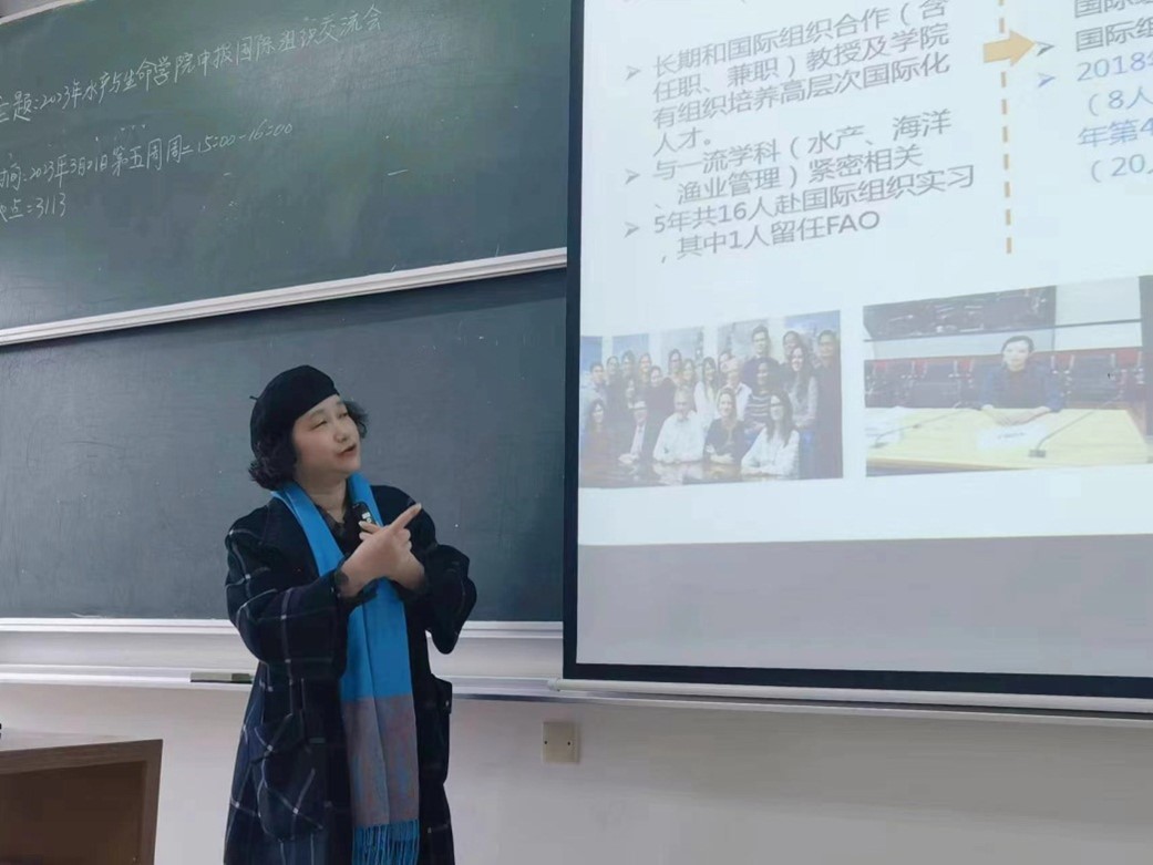 朱章华从全球视野导入,从中国国际组织任职现状、国际渔业组织人才培养情况以及国际组织实习生项目三个方面为学生们展开详细介绍。她指出,目前我国在国际组织中存在任职不足的问题并分析原因,同时通过学校历年赴国际组织实习交流的优秀典型人物事迹来鼓励同学们打开视野,大胆走出校门、走向国际,展示一流学子风采,为全球粮食安全、渔业发展提供中国智慧、中国方案。