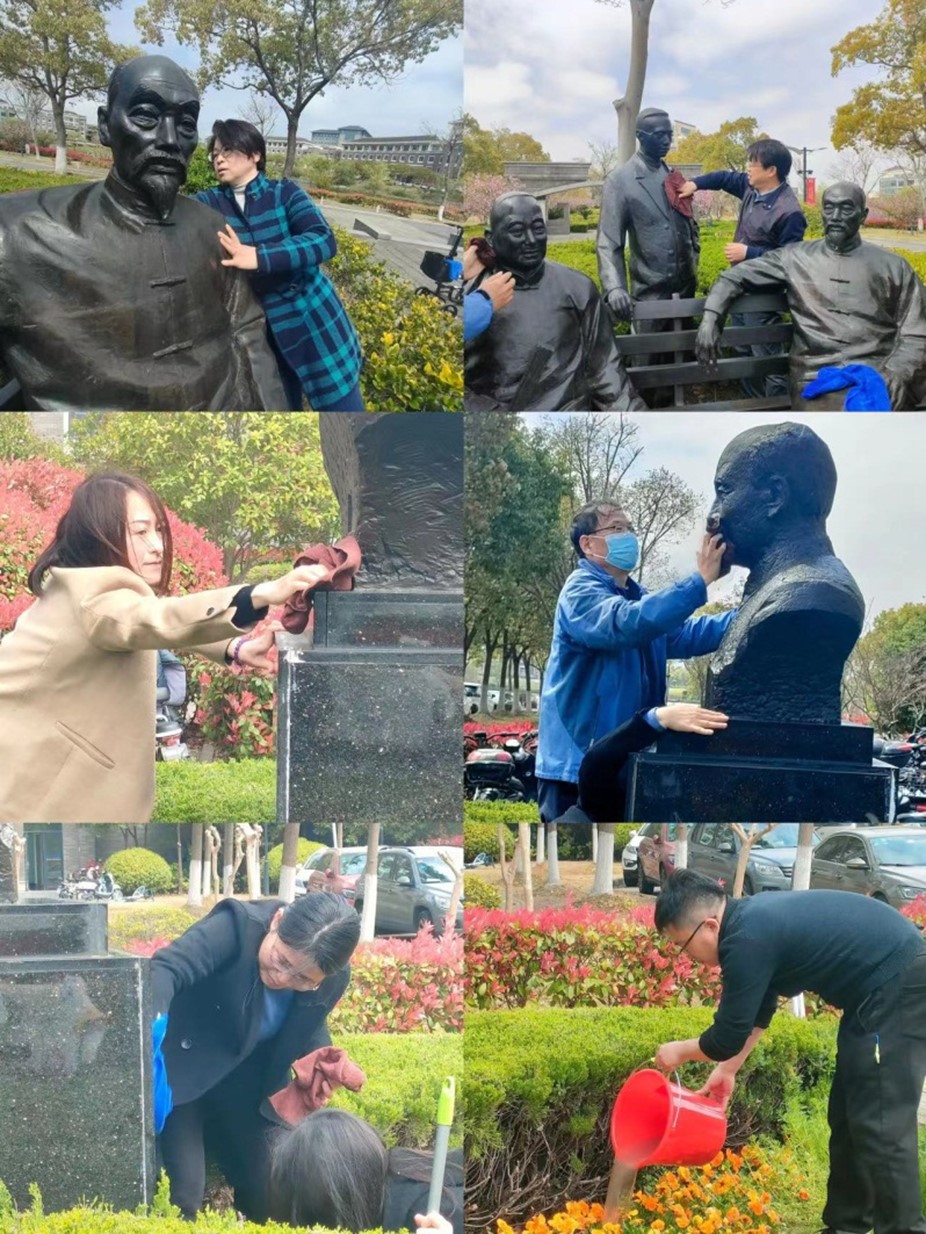 师生们在《饮水思源》雕像旁缅怀冰球突破mg正规官网创校三贤:著名民族实业家、教育家张謇和著名教育家黄炎培以及第一任校长张镠,擦拭先贤像以表敬意;清扫周边草坪、花圃,开展除尘、清扫工作。在学院党委书记高晓波的带领下,师生们在我国著名鱼类学家、中国鱼类学主要奠基人和水产教育家朱元鼎像前集体默哀,追思缅怀,再次感悟先贤们的创校精神和锲而不舍、精益求精的科研精神。