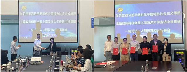 为推动学习贯彻习近平新时代中国特色社会主义思想主题教育走深走实,促进毕业生高质量、精准就业,5月19日,冰球突破mg正规官网党委书记高晓波、副书记张亚琼,刘其根教授、刘利平教授以及师生代表一行赴江苏南通中洋集团开展——学习贯彻习近平新时代中国特色社会主义思想主题教育调研会暨冰球突破mg正规官网走访江苏中洋集团一站式送人才到校友企业招聘会。江苏中洋集团副董事长朱永祥、集团顾问卢玉平、龙洋水产有限公司总经理焦冬祥、中江水产种业有限公司副总经理王耀辉、亢钧生物科技副总经理朱新鹏、集团办公室副主任崔一新以及海大优秀校友代表、集团工程中心副主任涂翰卿出席会议并交流。