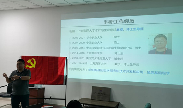 教授作学术分享,激励青年党员勇攀科研高峰。党员教师胡鹏教授、赵岩副教授结合个人科研方向分别就单细胞组学技术与应用、饲料鳜研究进展进行了学术报告分享。在交流互动环节中,研究生党员踊跃发言,针对自己科研中遇到的问题积极提问与请教,两位老师及在座的老师都毫无保留地进行了耐心解答,为同学们以后的科研生活提供了宝贵的经验和启示。