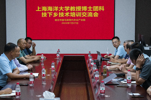 7月27日下午,服务团驱车前往宿迁骆马湖现代农业产业园,宿迁市湖滨新区党工委委员王信海、宿迁市骆马湖水产集团总经理朱苏州和发展部部长葛永春等接待了教授博士服务团一行,双方首先在霸王蟹产业研究院会议室进行了座谈和培训,骆马湖现代农业产业园内的主要河蟹养殖企业和示范户均参加了座谈和培训,吴旭干和张俊分别进行了《河蟹公母分养关键技术及应用》和《智慧水产场景建设及应用》的培训,并与养殖户及技术人员进行了互动。随后,服务团参观了霸王蟹产业发展研究院实验室、展示厅、学生宿舍、实验池塘和包装车间等,并同冰球突破mg正规官网驻研究院的研究生进行了交流;最后,服务团在王信海和葛永春的带领下前往产业园内的扣蟹和成蟹养殖池塘进行技术服务和交流,服务团就水草管理、稻蟹共生、公母分养和大规格蟹种培育等进行了现场讲解和讨论。霸王蟹产业研究院的科研条件、蟹文化科普和霸王蟹品牌推广给服务团留下了深刻的印象,如何通过科技赋能和三产融合推动河蟹产业高质量发展是值得服务团和河蟹产业界共同努力的方向。