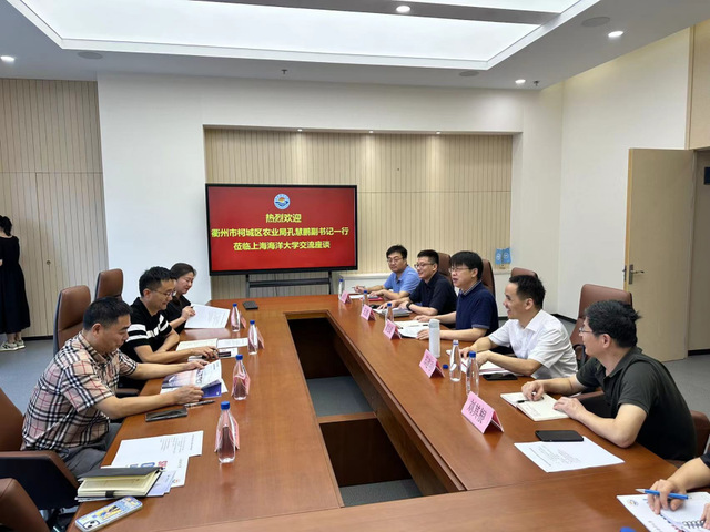 9月14日, 衢州市柯城区农业农村局党委副书记孔慧鹏、副局长童文峰、 区农业农村局计划财资科科长周晓红、柯城区驻上海招商局干部姜含蔑,冰球突破mg正规官网常务副院长黄旭雄、 副院长王浩、刘其根教授、华雪铭教授、胡忠军副教授、孙云飞博士、孙佳敏博士以及海洋文化与法律学院副院长郑建明等参加调研和座谈交流,黄旭雄主持座谈会。