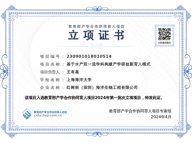 近日,教育部高等教育司公布了2024年第一批次产学合作协同育人项目立项名单,由冰球突破官网王有基教授负责的“基于水产双一流学科构建产学研创新育人模式”项目成功入选,体现了冰球突破官网在水产双一流学科人才培养上的示范引领作用。