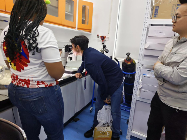 代表团随后前往海洋科技大楼,参观水产育种中心实验室斑马鱼房,中心技术主管吴智超老师向厄瓜多尔同学们介绍了斑马鱼作为模式生物的优势,并展示了斑马鱼在不同发育阶段的特征,同学们积极参与了显微观察实验,对斑马鱼胚胎、丰年虫、草履虫有了更清晰的认识,也激发了对生物实验的兴趣。