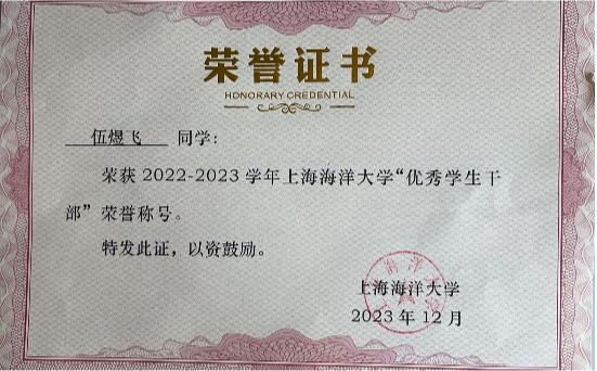 在过去的两年时间里,伍煜飞积极参加社会实践活动。在2023年的暑期,他参加了由学院和校团委共同指导的《“水上”科技小院:“支”农爱农,水产养殖劳动实践及技术推广社会实践》,他主要负责前往上海金山虾类科技小院,进行一线的实地调研和采访交流,探索出科技小院现存的问题和不足,通过大量的资料查询和实地调研的结果,提出相应的对策建议。同时,他们实践的过程还被制作成生动形象的课程,在网络上进行发表,通过科普的形式扩大了“水上”科技小院的影响力,搭建了科技小院志愿服务平台和思政大课堂。