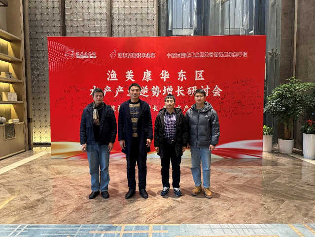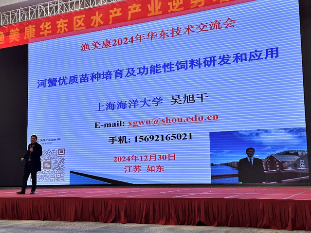 12月30日上午,团队一行参加了渔美康集团举办的“渔美康华东区水产产业逆势增长研讨会”。与会的专家、学者围绕江苏虾蟹养殖规模、养殖模式和加工流通现状、国内外渔药研发概况、使用情况、存在问题和发展方向、水产饲料和动保产品等方面进行技术交流。渔美康集团领导做了“2024年养殖效益数据报告”和“渔美康研发概况和新产品介绍”的报告。吴旭干针对“河蟹优质苗种培育及功能性饲料研发和应用情况”作专题介绍。