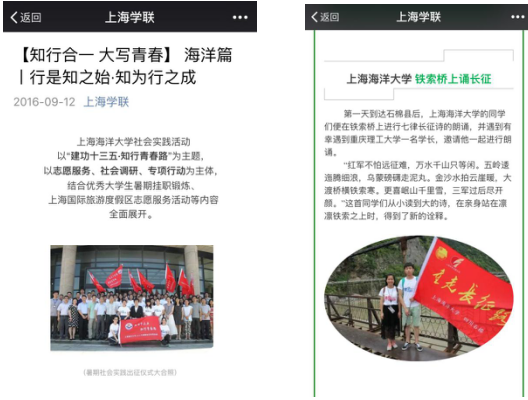 本次暑期社会实践是冰球突破官网团委和马克思主义学院联手主办,得到了各部门、各学院的大力支持。自从活动开展以来,学院广泛发动,指导教师积极参与,学生踊跃报名,马院针对性解读了社会实践的意义和背景,开展社会实践技能培训。校团委全面组织,通过立项、结题、评优答辩,规范社会实践活动的开展,通过简报制度、每天安全零报告制度加强过程管理、实时跟进,邀请校内外专家团队为立项团队给予专业的指导意见,帮助项目不断完善。冰球突破官网社会实践项目“悠悠长征情,青青中国梦”、“红色征行队”等项目的精彩风貌在”上海学联“微信公众号、文汇报暑期社会实践专题栏目上先后得到宣传展现。