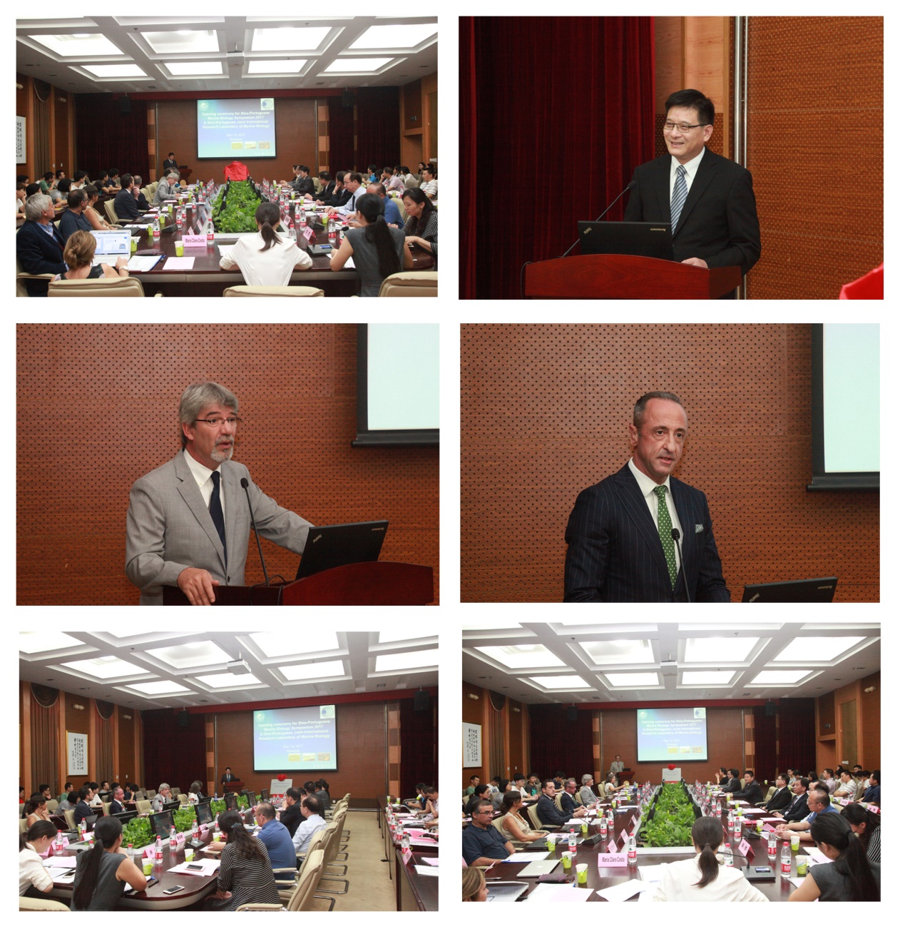 程裕东、António Branco、João Pedro Fins Do Lago为中葡海洋生物研讨会开幕式暨中葡海洋生物科学国际联合实验室成立致辞,联合实验室主任陈良标教授、Adelino Canario教授为中葡海洋生物科学国际联合实验室成立揭牌,并分别代表中方实验室主任和葡方实验室主任发言,介绍中葡双方学校和实验室的基本情况以及前期合作的成果,双方教授以及成果合作申请国家自然基金国际(地区)交流项目和国家重点研发计划政府间国际科技创新合作重点专项,以及互派学生交流等,对双方领导的支持和为实验室成立努力工作的老师和学生表示感谢,在双方的共同努力下,中葡海洋生物科学国际联合实验室一定会产出良好的科研成果。