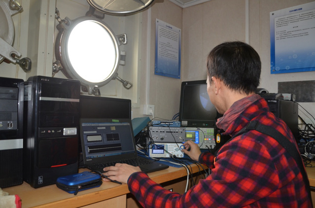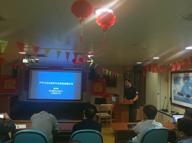 童剑锋携带冰球突破官网自主研发的宽带声学测量系统,一共获取了14个站位214GB的宽频超声波回声散射数据;并且在阿蒙森海37个考察站位使用雪龙船上的科学鱼探仪系统EK60进行了生物散射层观测,同时协助对EK60进行了系统校正;在雪龙船航行期间还作了“声学方法在海洋生态系统观测应用”的交流报告。