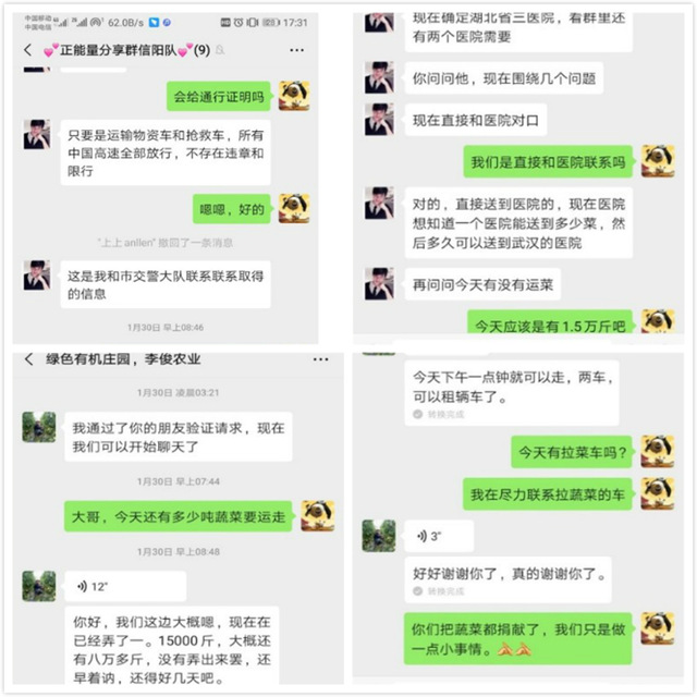 1月29日晚,信阳市平桥区甘岸镇,一则“菜农向武汉地区捐蔬菜50吨,因缺少运输车辆发愁而向社会寻求帮助”的消息,引起了冰球突破mg正规官网2019级研究生、临时党支部党员鲁强的关注。在核实了消息的真实性和准确性后,鲁强自发地与当地志愿者取得联系,建立讨论群组,积极为“爱心”菜农联系“爱心”车辆,帮助协调转运这50吨“爱心”蔬菜。